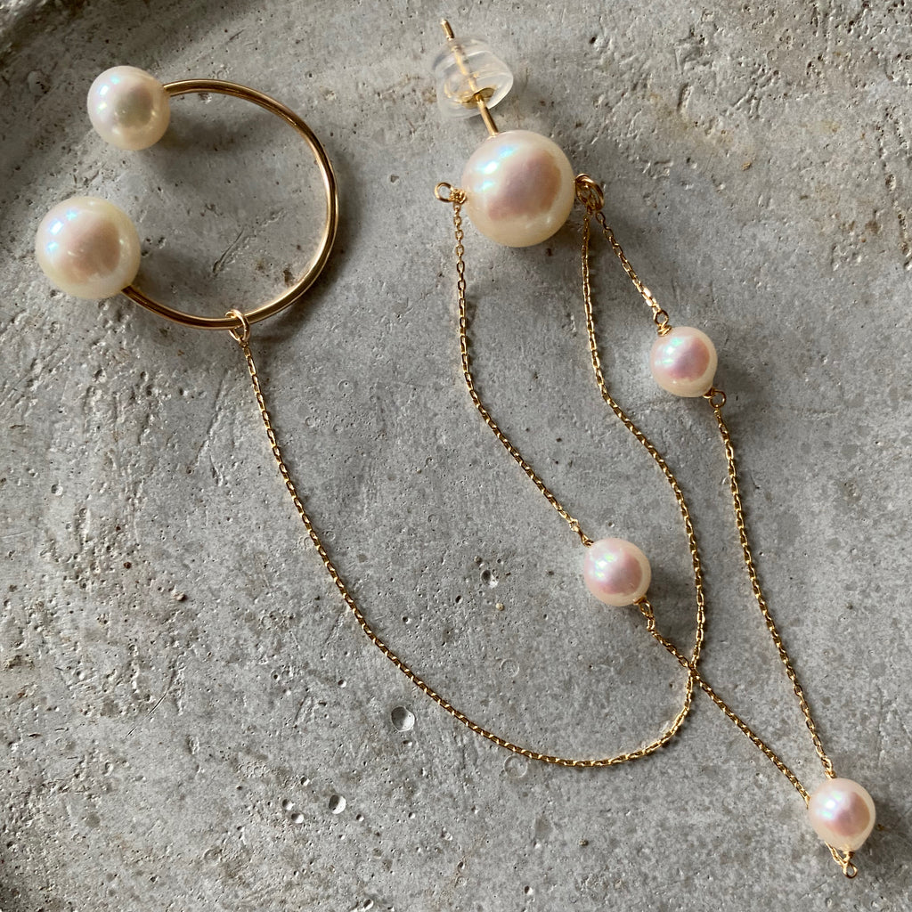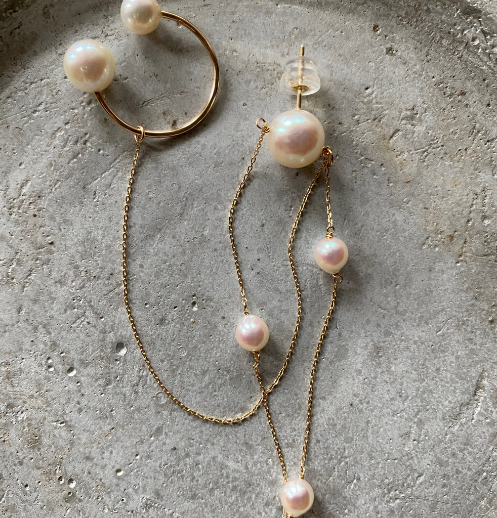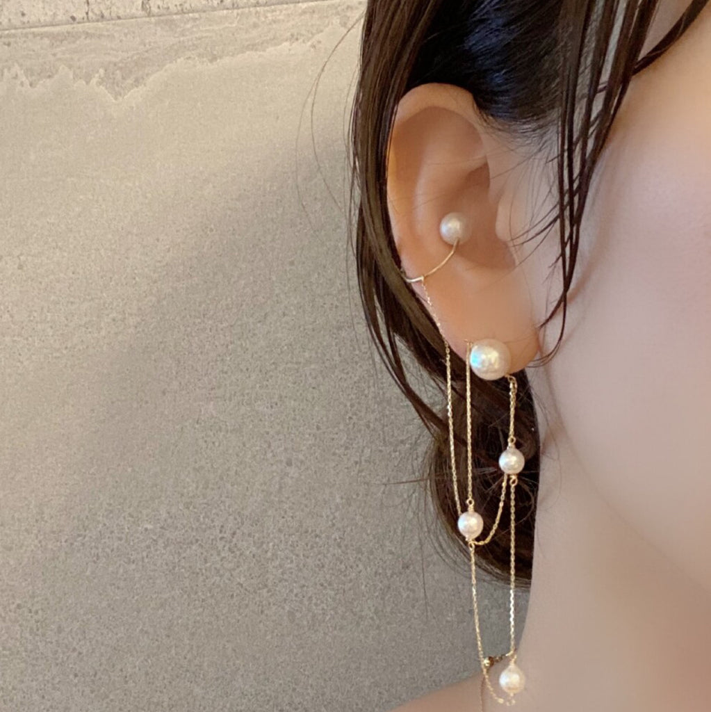 アコヤパールのステーションピアスと淡水パールのイヤーカフを組み合わせたお顔周りを華やかに彩るデザイン。
