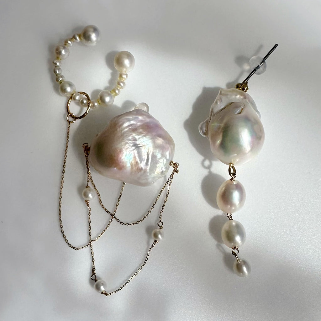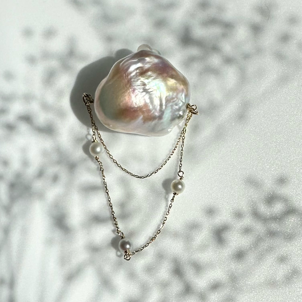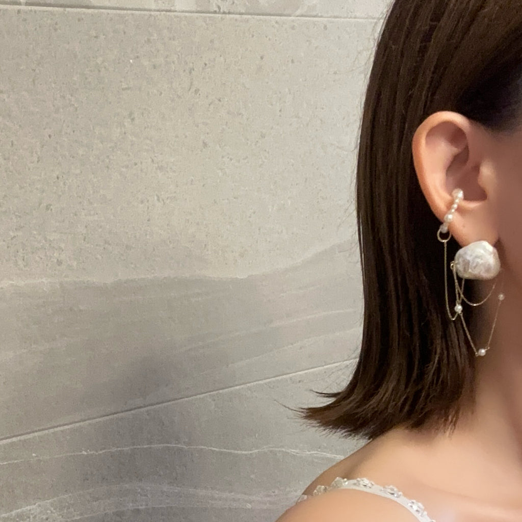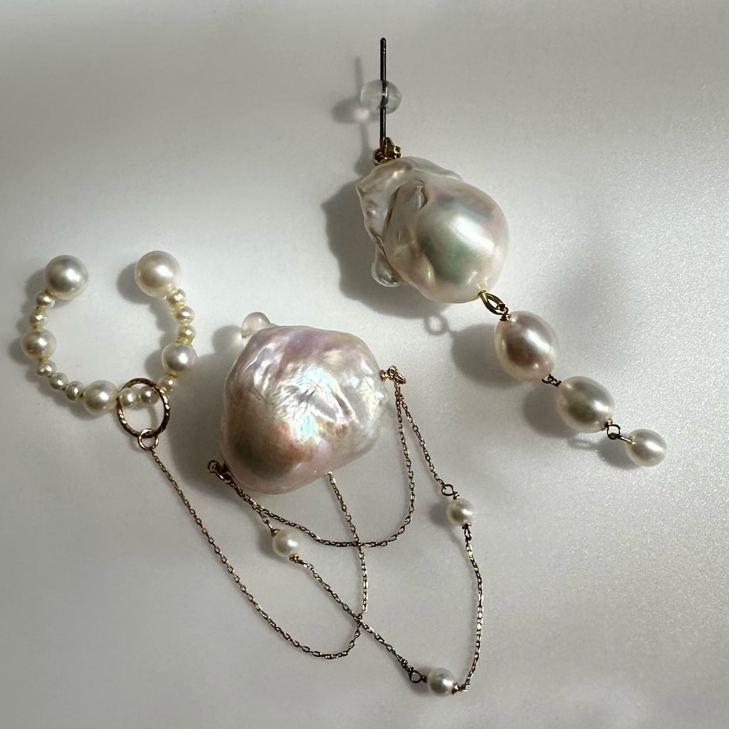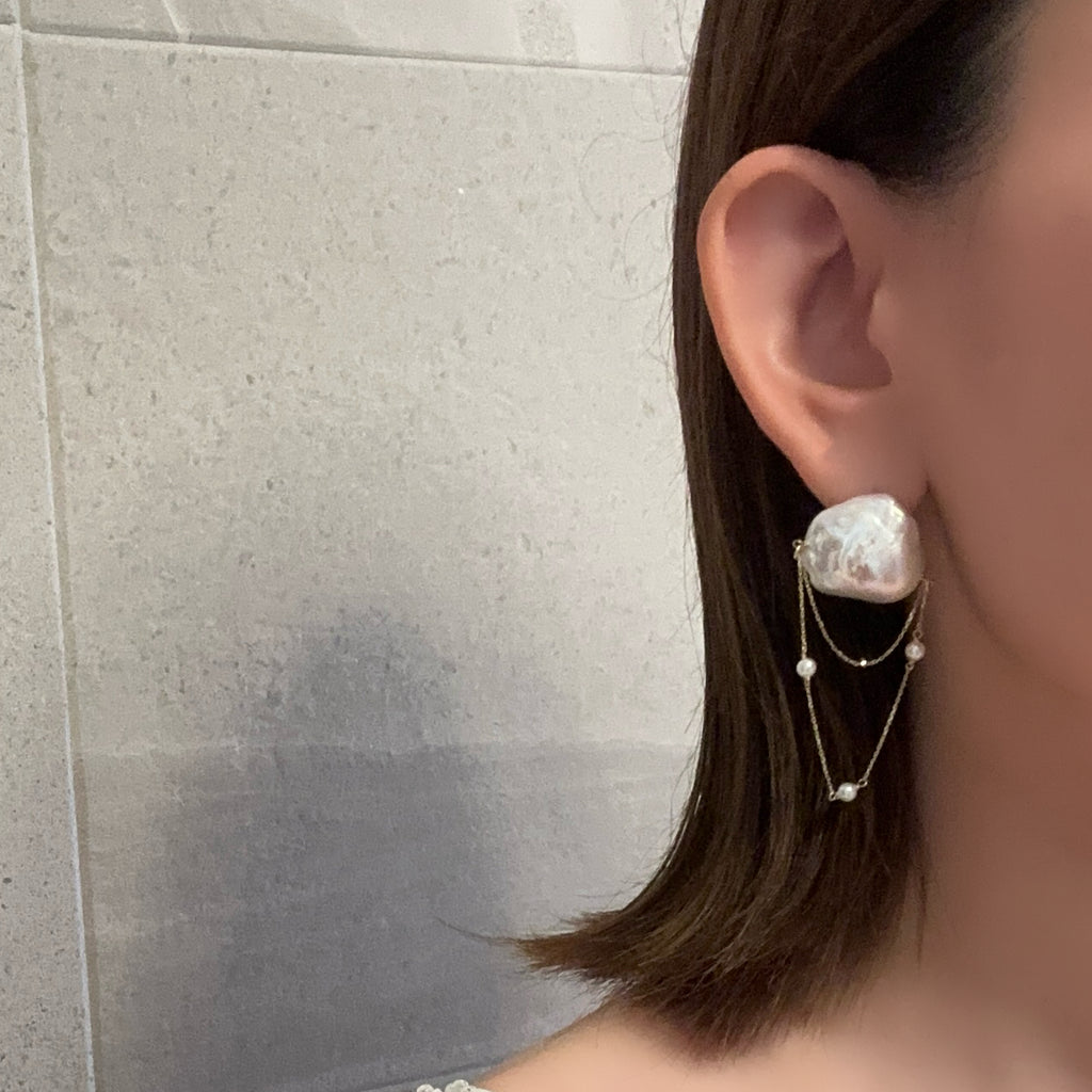 パールの美しい照り感と艶の輝きとたっぷり使用したゴールドチェーンが揺れる度にキラキラ輝く煌めきを楽しめます。