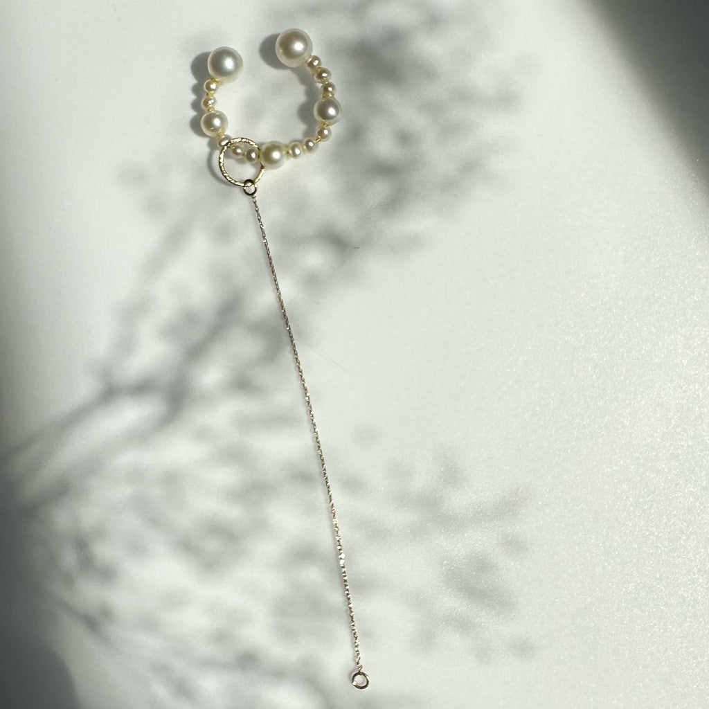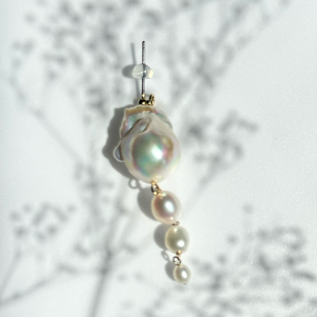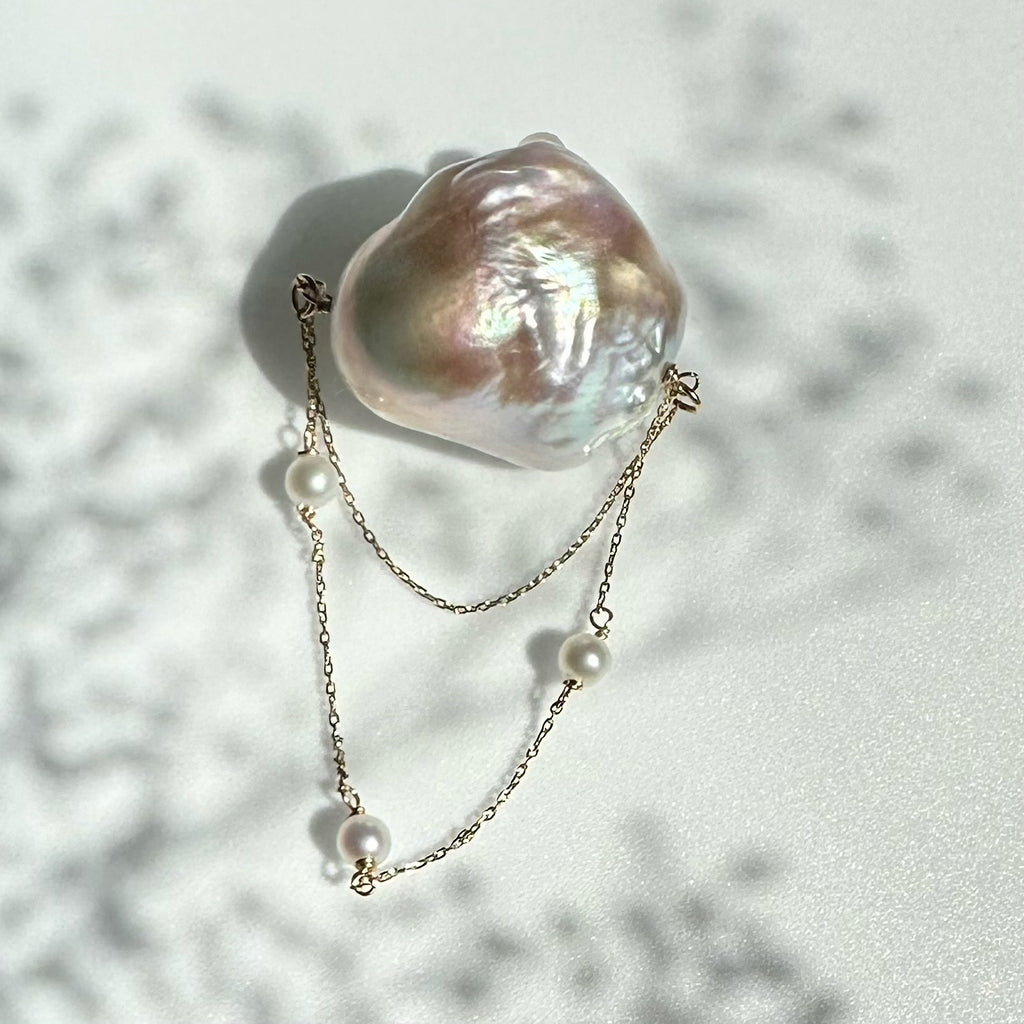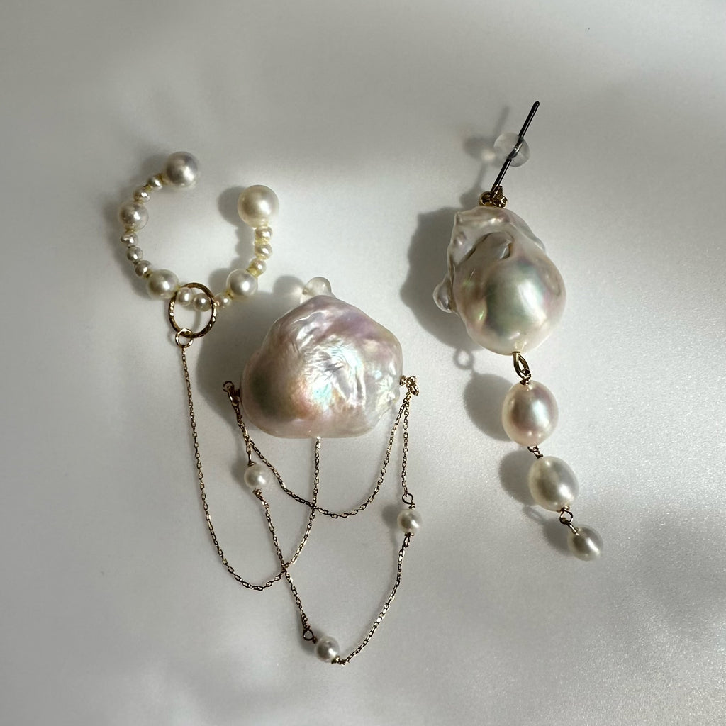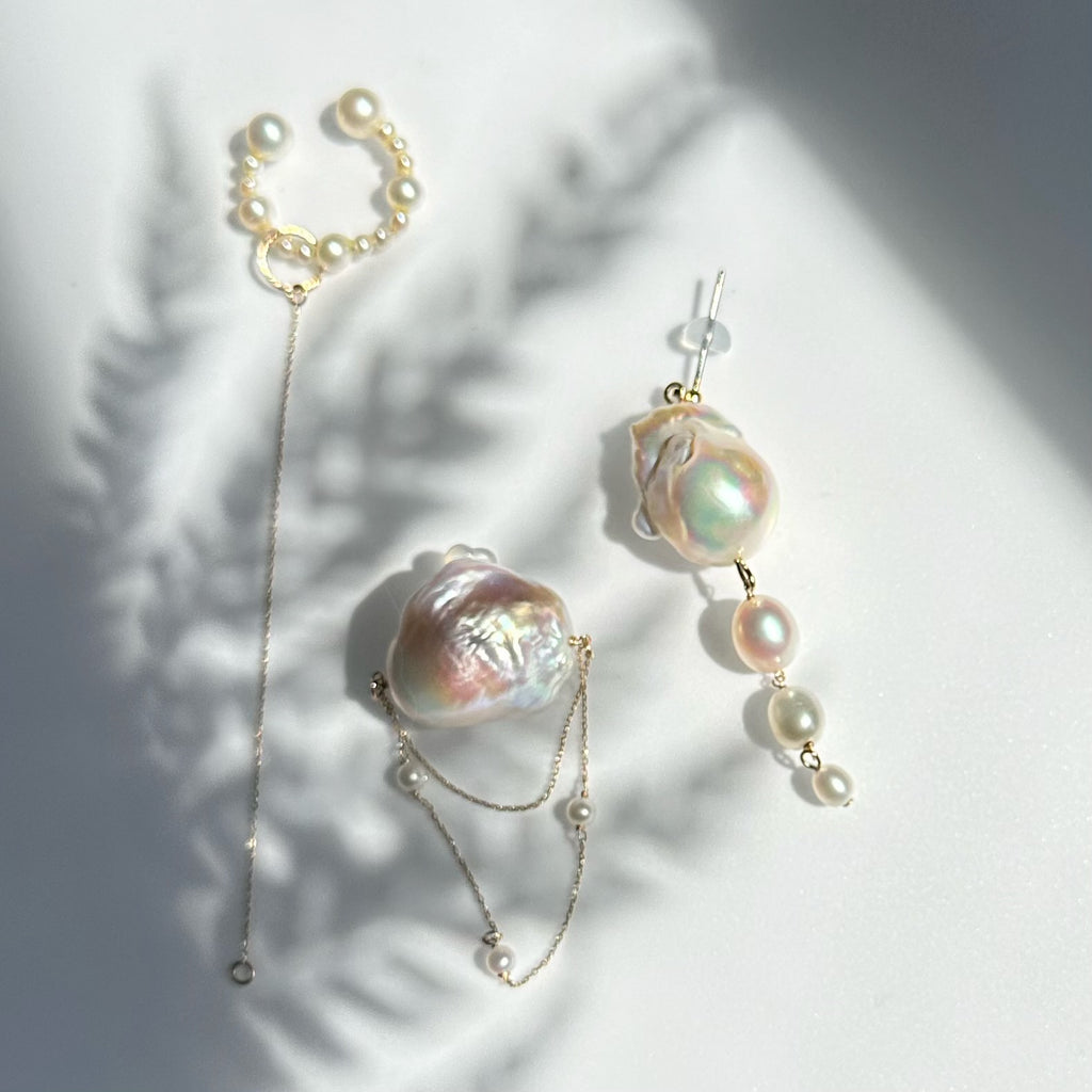 パールの美しい照り感と艶の輝きとたっぷり使用したゴールドチェーンが揺れる度にキラキラ輝く煌めきを楽しめます。