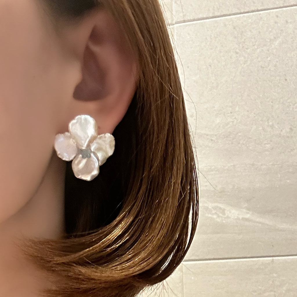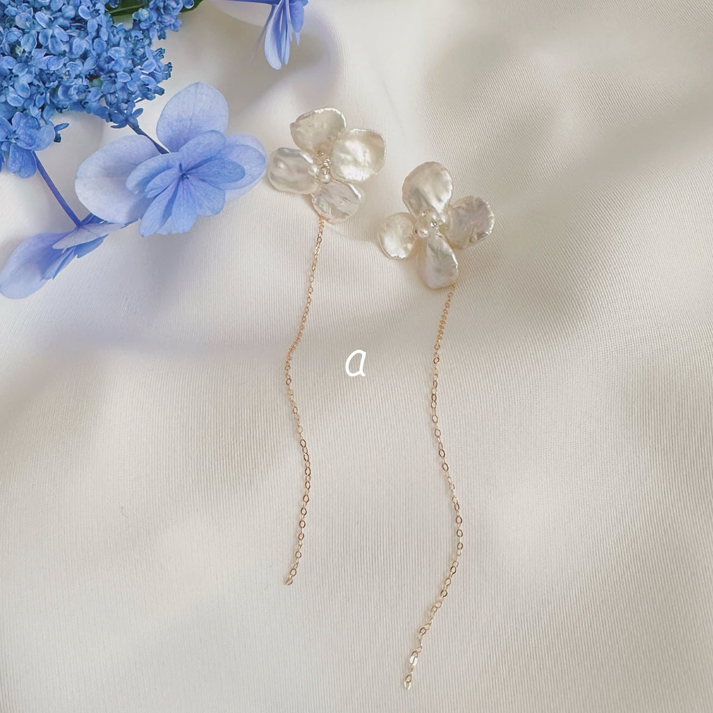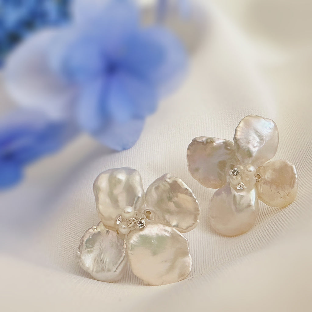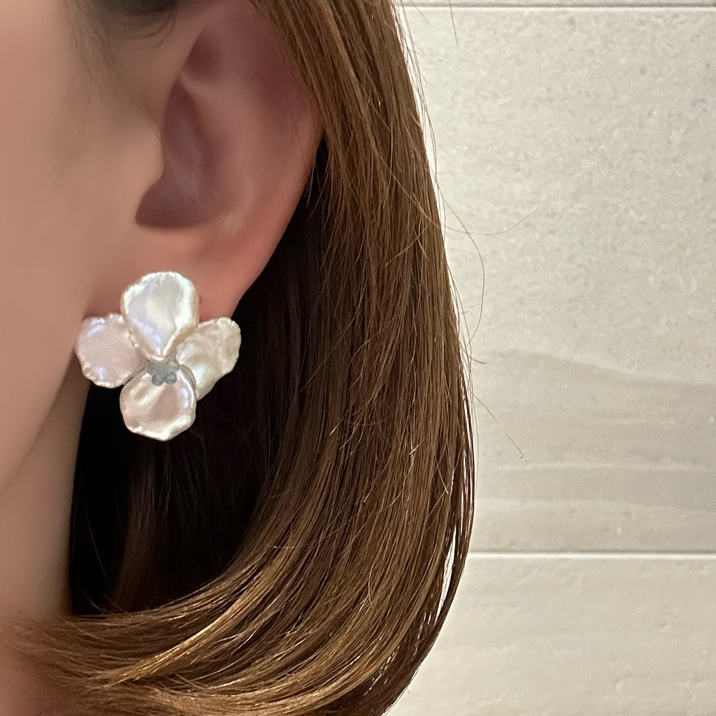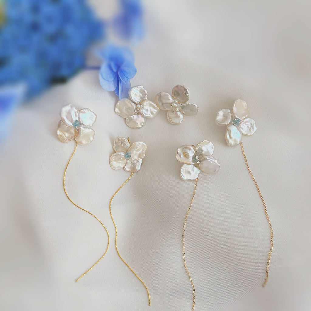花びらパールを紫陽花に見立ててお作りした立体感のある華やかな印象のピアス、イヤリング。