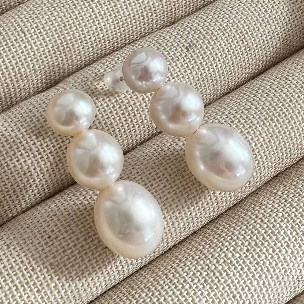 大きなサイズのパールは年月をかけて成長するため成長過程で傷やエクボができやすいのですが美しいパールが1ペアあったため今回3連デザインにてお作り致しました。