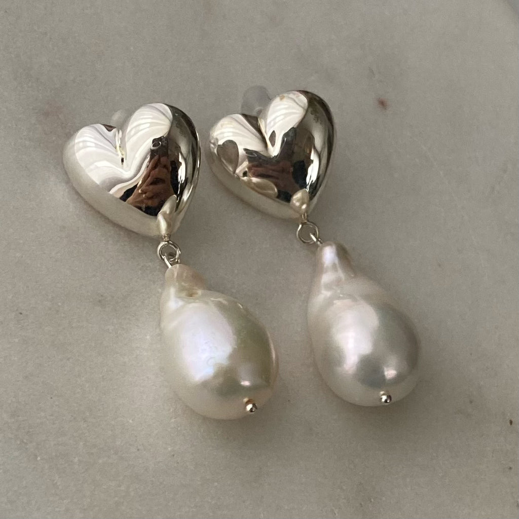 マベパールのハートをイメージしてお作りしたぷっくり可愛いらしく上品なハートにバロックパールを合わせたピアス、イヤリングです♡