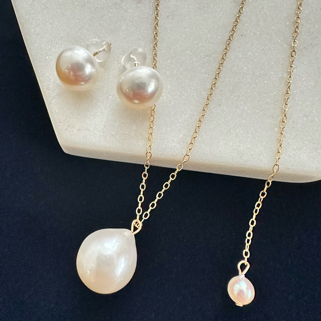 大粒で可愛らしいティアドロップのパールロングネックレスと選び抜かれた上質でテリ、ツヤが美しい一粒パールのピアス、イヤリングのセットです。