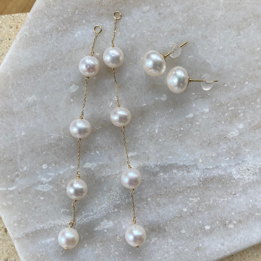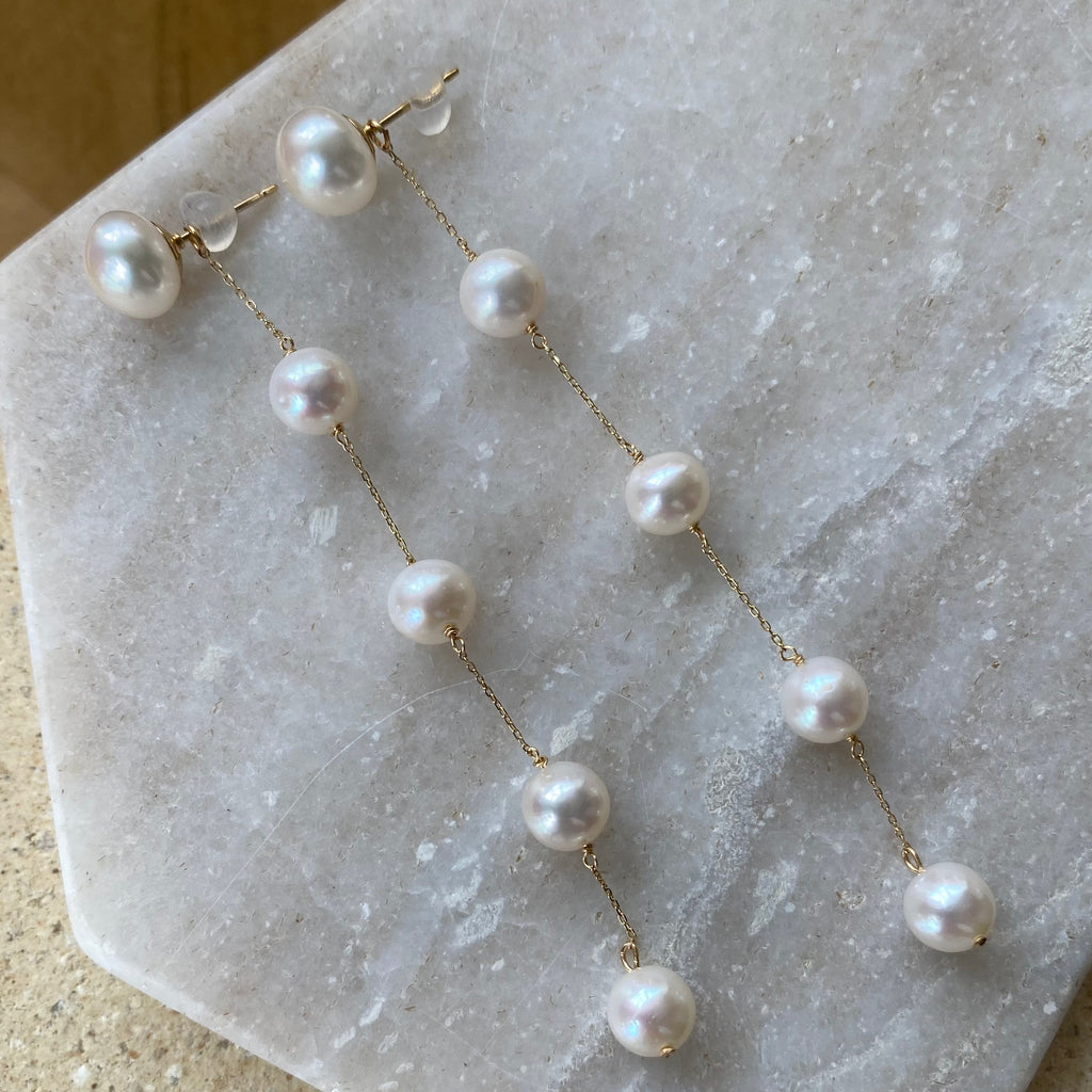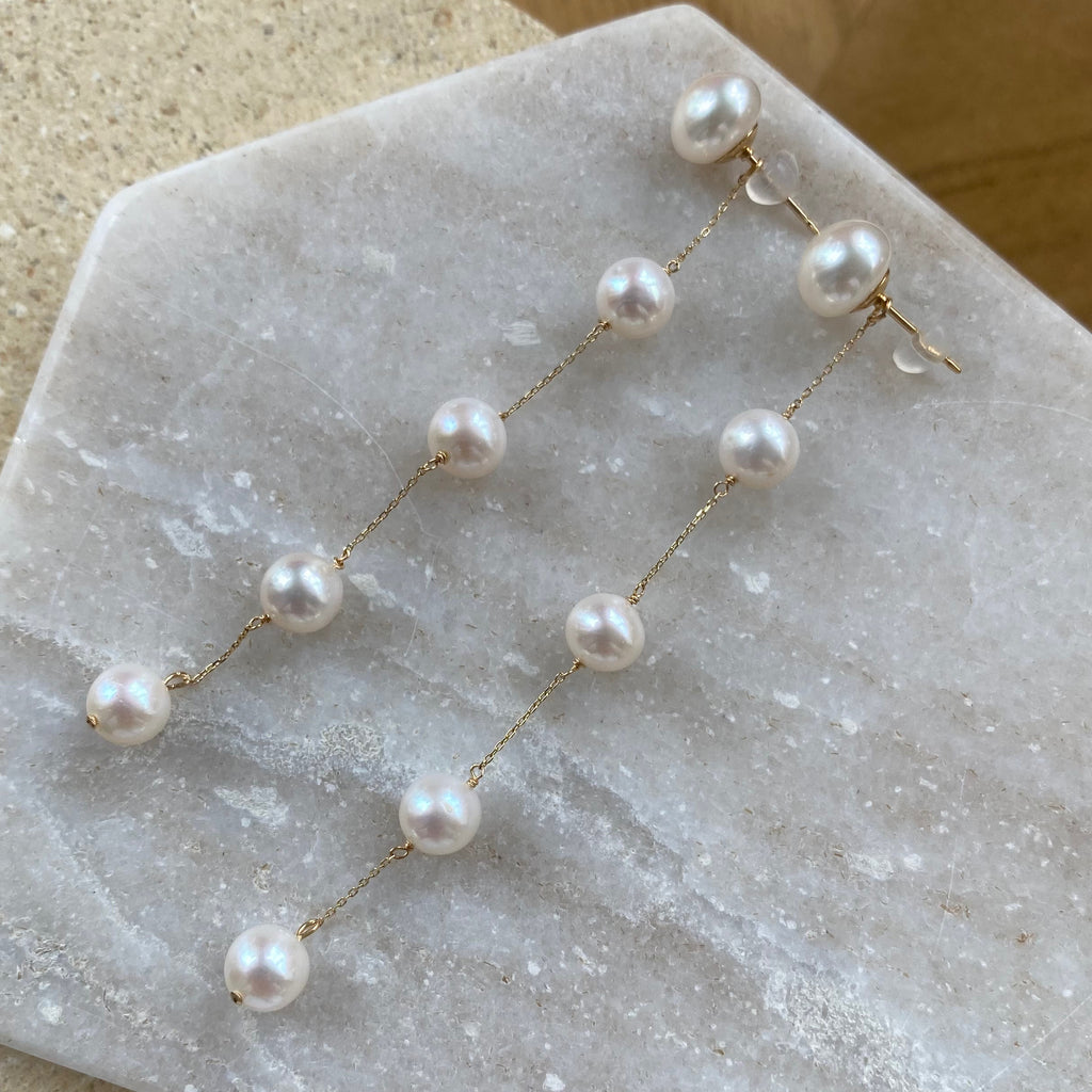 まんまるコロンとしたかたちのパールが美しいロングデザインピアス、イヤリングです。