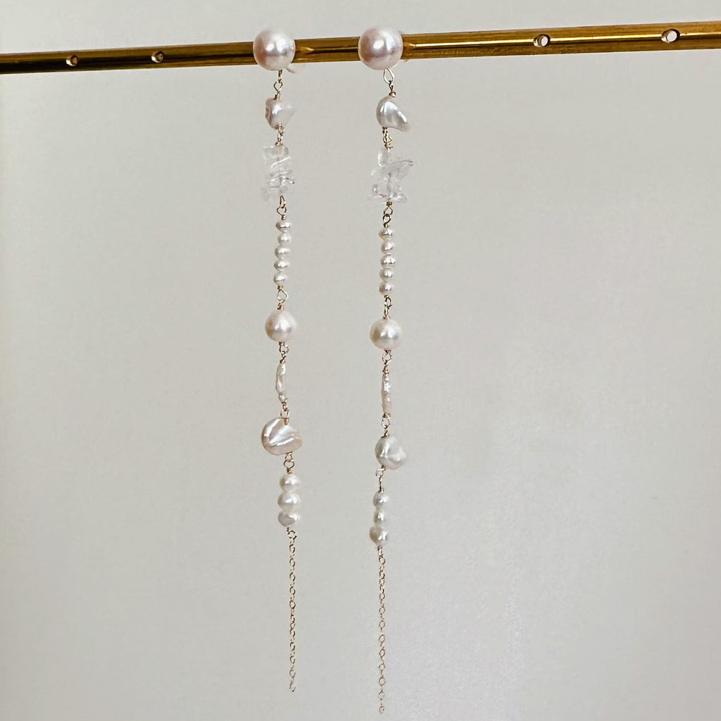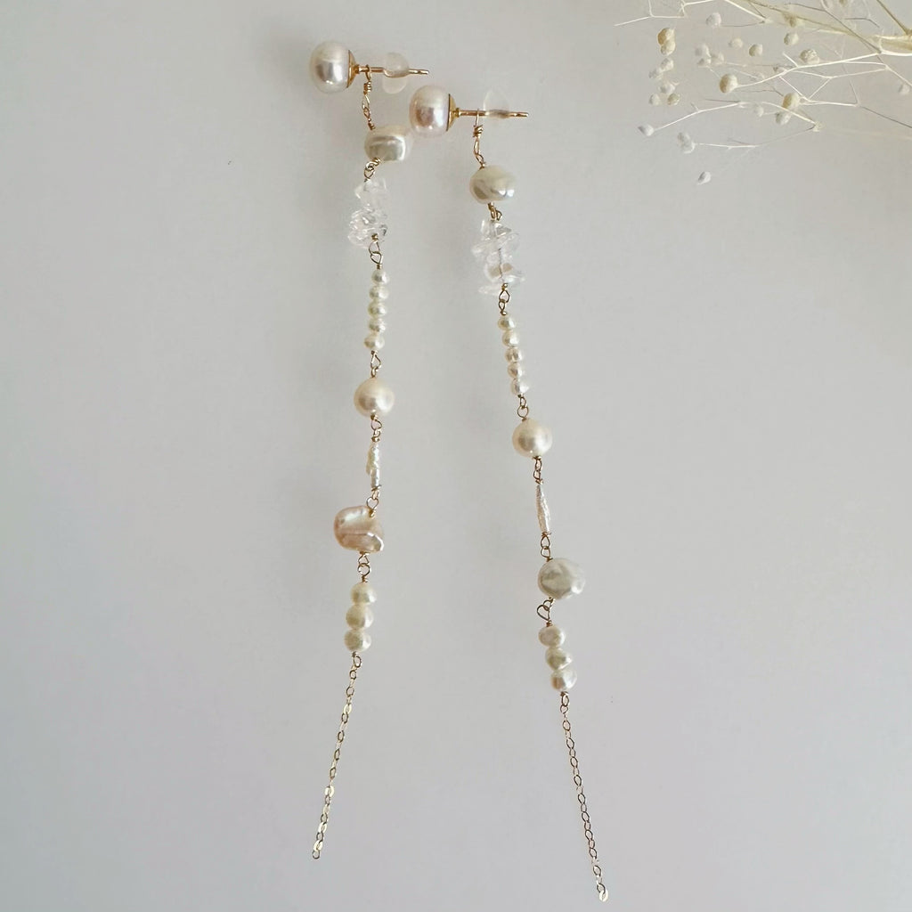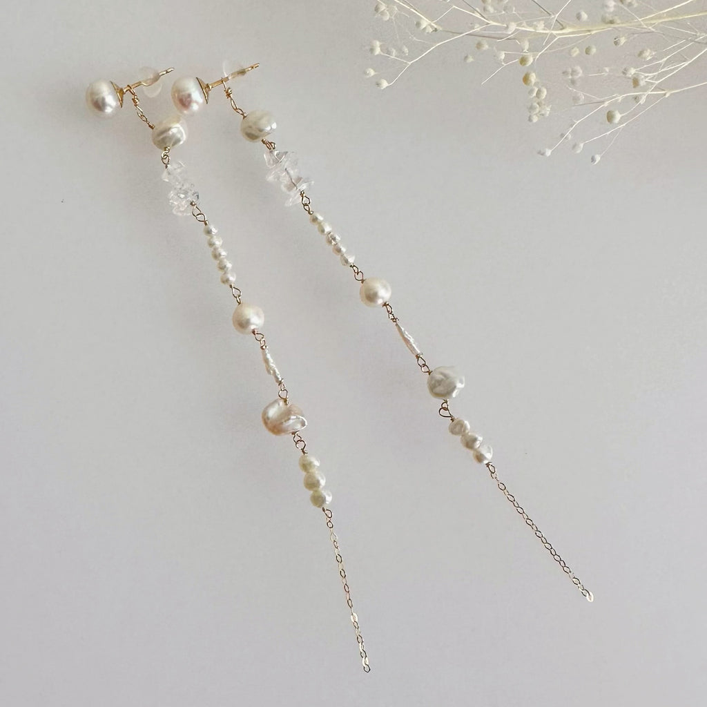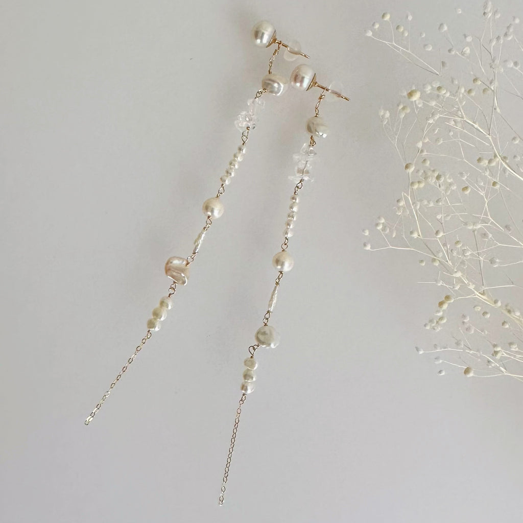 小ぶりで美しい形状のさまざまなパールや天然石を連ねたロングピアス、イヤリングです。