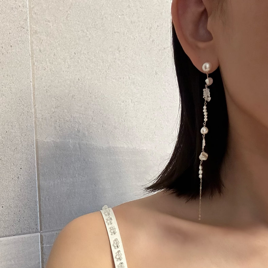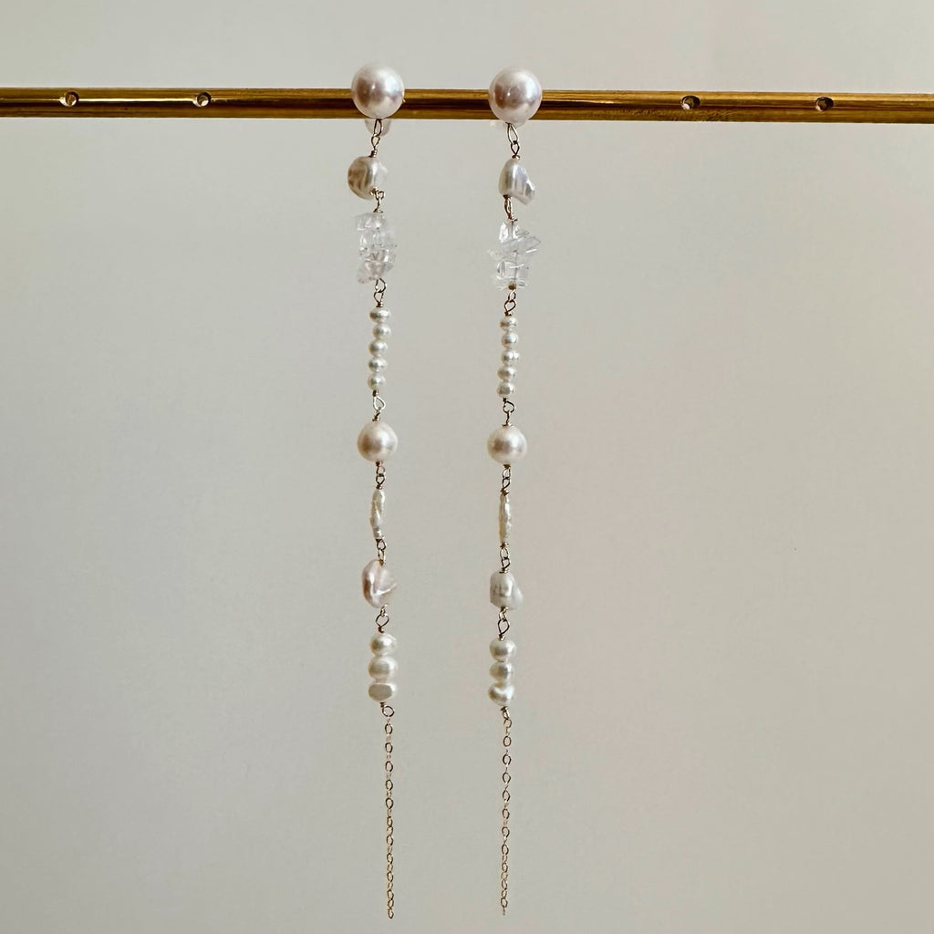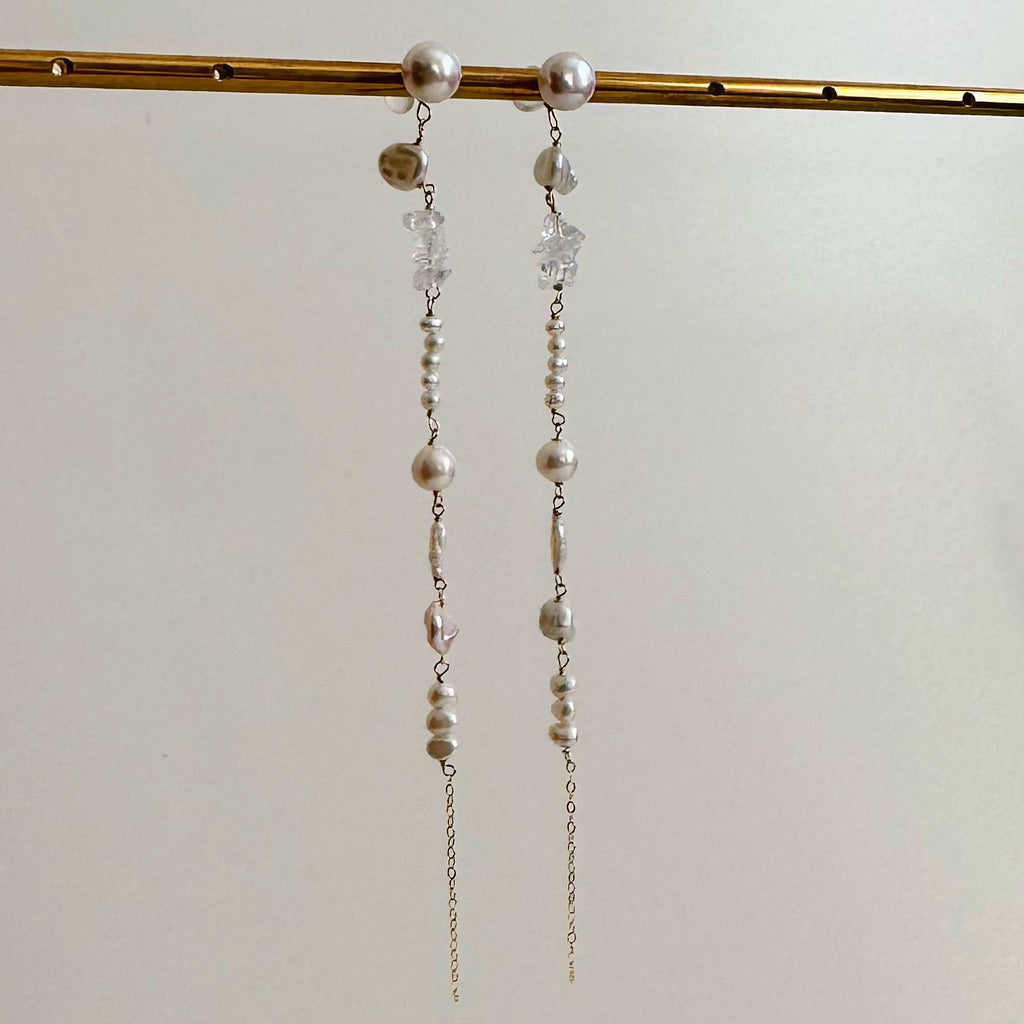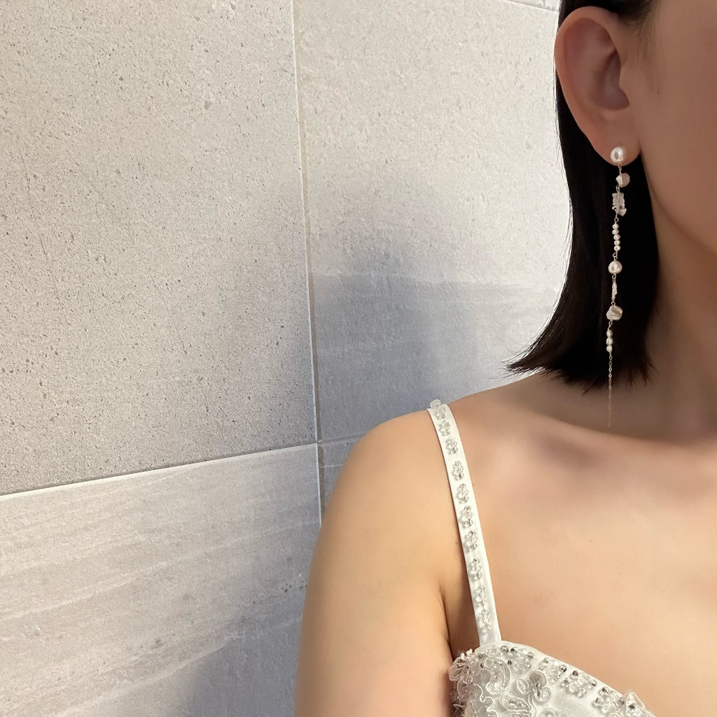 小ぶりで美しい形状のさまざまなパールや天然石を連ねたロングピアス、イヤリングです。