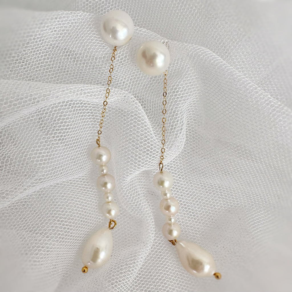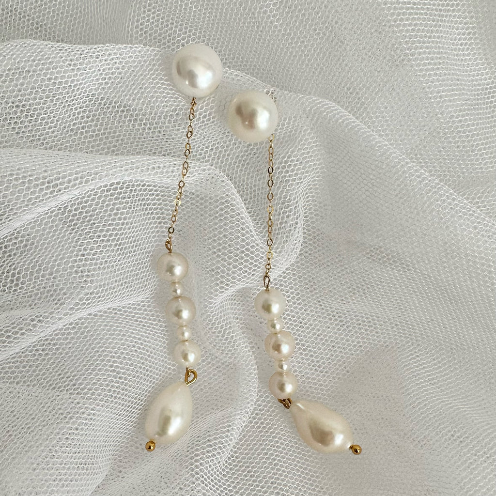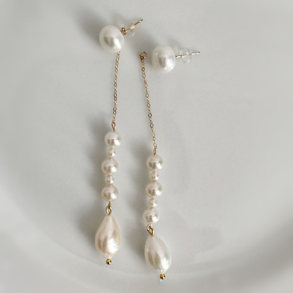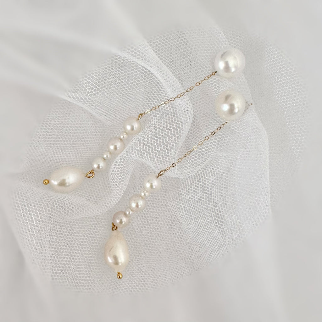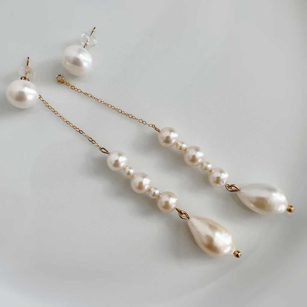 ベビーパールやバロックパールを組み合わせたバリエーションを楽しめるデザインのロングパールピアス、イヤリングです。