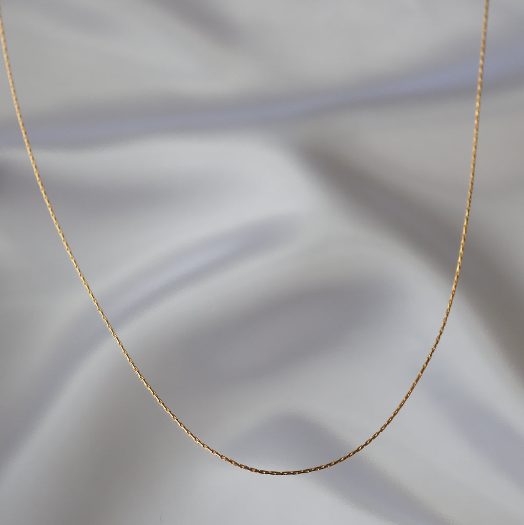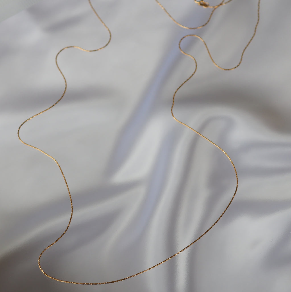 This is a long necklace made of 14kgf material, which is firm and flexible.