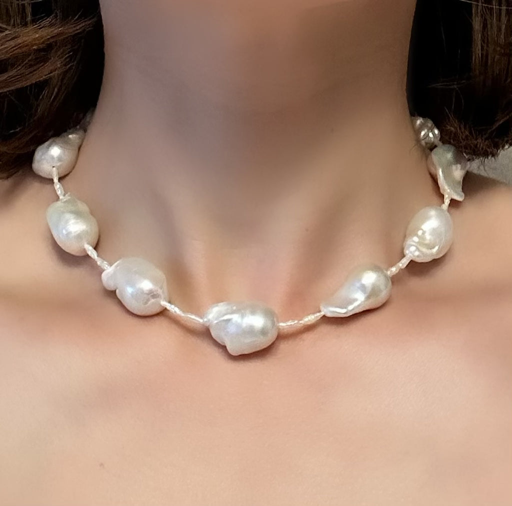 A necklace combining high-quality baroque pearls and poppy pearls.