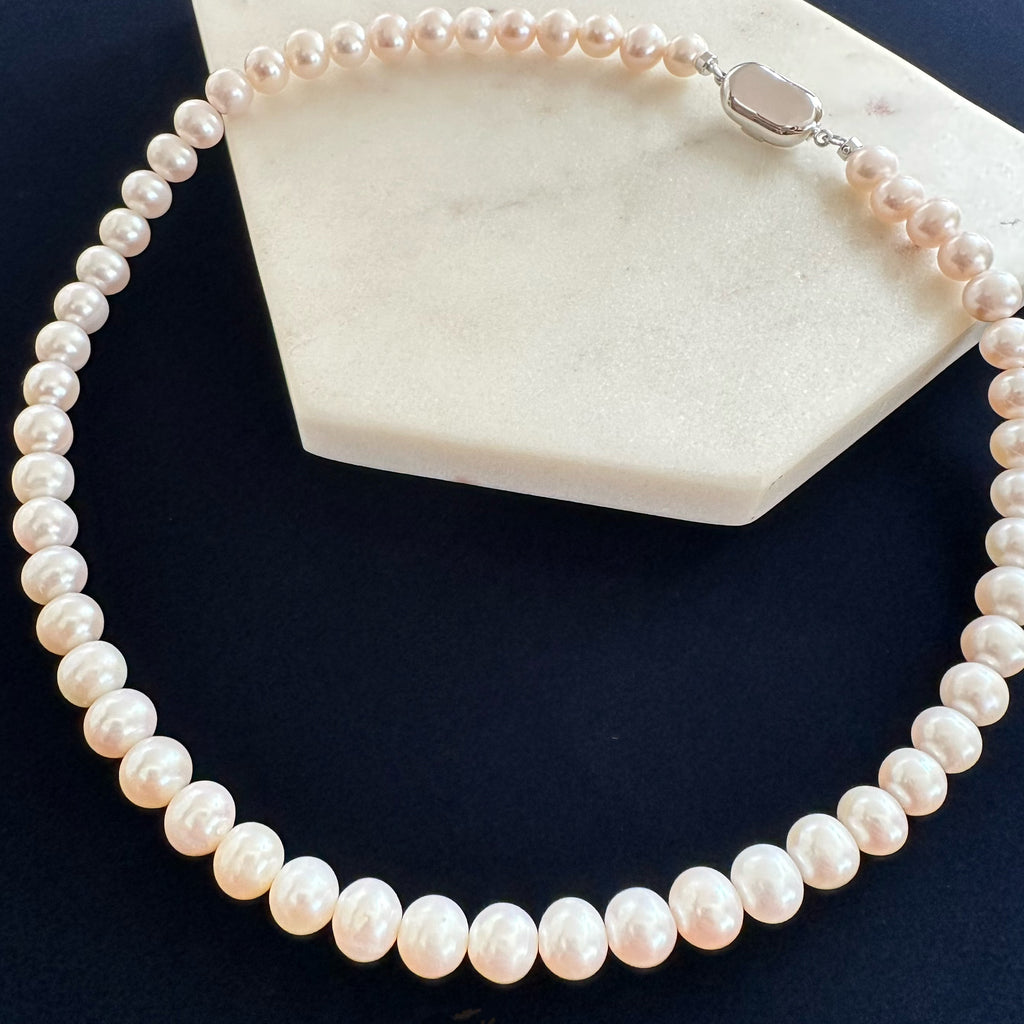 As you can see in the photo, the pearls used to make the necklace have very few circles or dimples, which are called blemishes, and have good luster and shine.We have carefully selected only the most beautiful pearls.